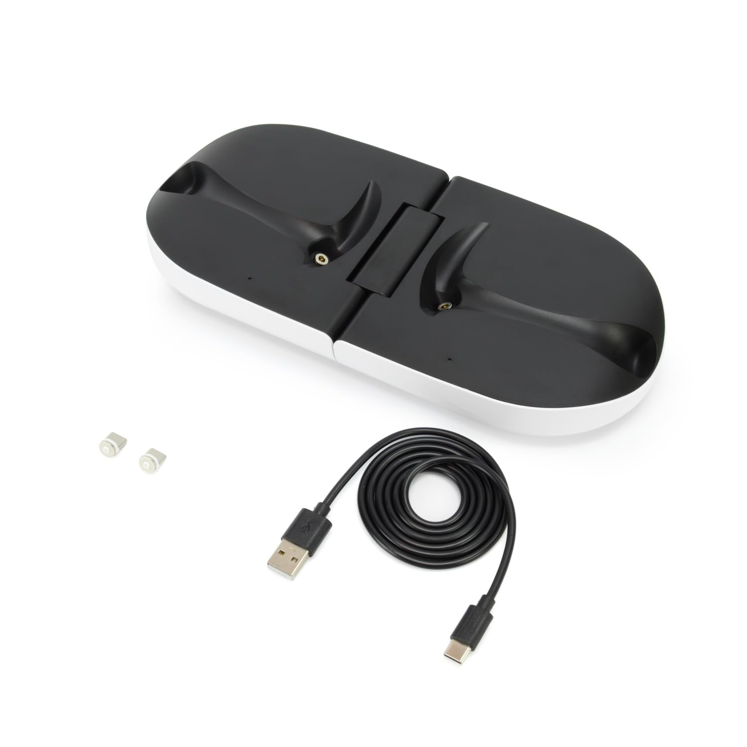 Simply place the PSVR2 compatible controller for easy charging. Foldable and convenient to carry. Feature 1: You can charge 2 PSVR2 controllers at the same time. It does not affect the sophisticated design of the controller. Feature 2: Simply attach the included magnetic terminal and place it on and start charging. In addition to the magnetic terminal, the dedicated charging cable is also included. Feature 3: When not in use, it can be folded and stored compactly for easy carrying. Size when in use: Approx. H 11.8 x W 10.4 x D 5.0 inches (30 x 264 x 126 mm); Size when folded: Approx. H 2.4 x W 5.2 x D 5.0 inches (60 x 132 x 126 mm).